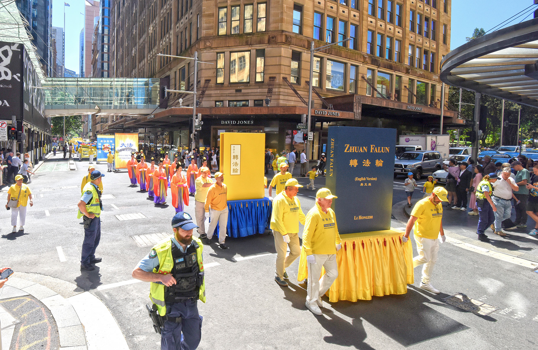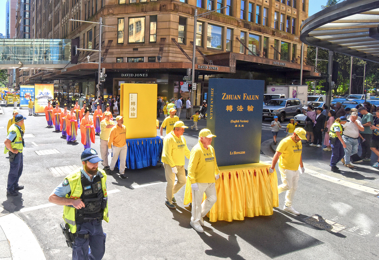 接踵而至的是中文和英文《转法轮》巨型书模、超凡脱俗的仙女队伍、威风凛凛的舞龙队、祥和的功法演示队伍、色彩缤纷的彩旗队伍以及“世界需要真善忍”“法轮大法好”中英文横幅队伍等,传递着法轮功的核心理念和祥和能量。