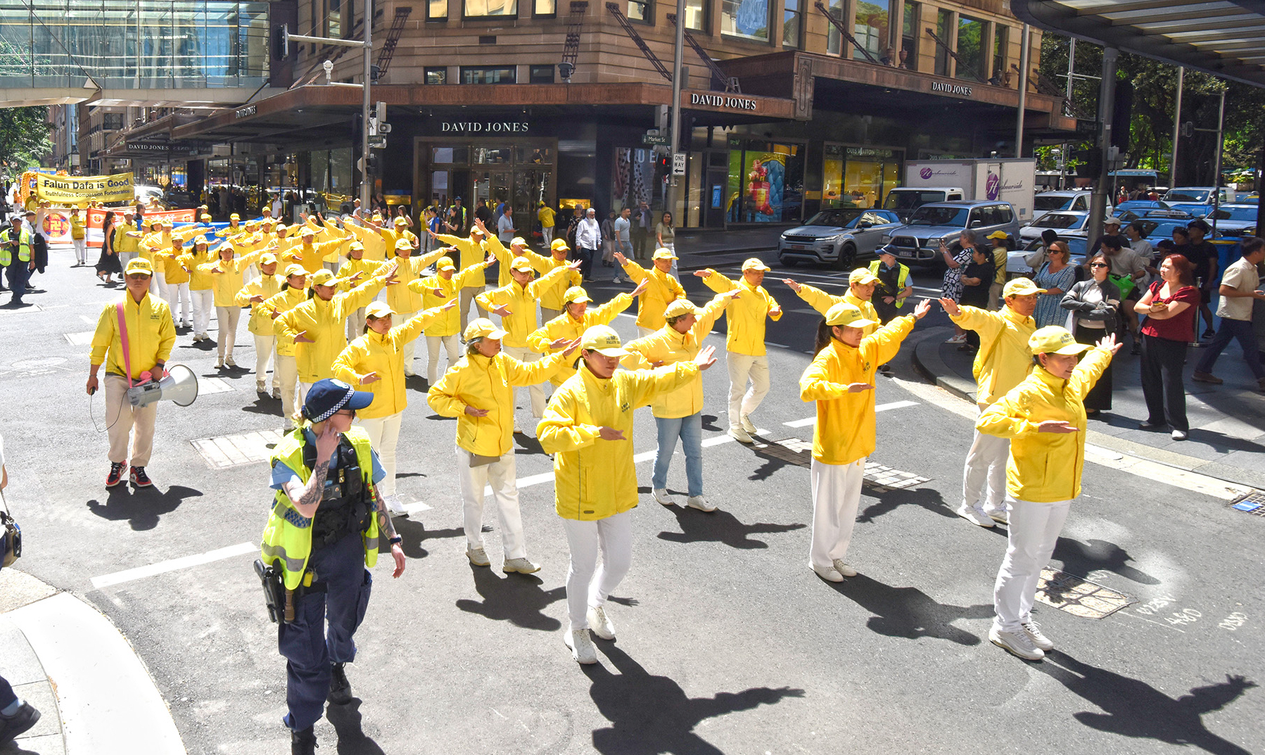 2025年10月11日,周五(10月10日),来自全澳各地的部分法轮功学员汇聚在悉尼金融与商业中心,举行了一场声势浩大的和平游行。绵延数百米的游行队伍,以铿锵有力的鼓乐、中英文双语的醒目横幅及祥和的功法展示,向世人传递法轮大法的美好,警示中共极权对全球的危害,并唤醒世人坚守良知与正义。