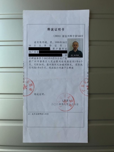 2024年8月陈邦超被刑满释放,在2024年10月至2025年9月间,他至少六次被国保或公安传唤,被警告只能“接触国家批准的媒体,不得翻墙或绕过审查。” 2024年9月27日,他尝试续签港澳通行证时,被告知已经被限制出境。2025年9月,他再次申请,被电话通知不允许签注。