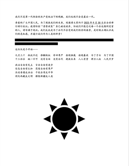 宣言中写道:“抵抗不迟、推翻极权、夺回尊严、拒绝独霸、拒绝暴政、为了子女、为了中国十三诉求、缺一不可、没有自由、没有后代、挽救未来、人人有责、捍卫人权、人民万岁”。