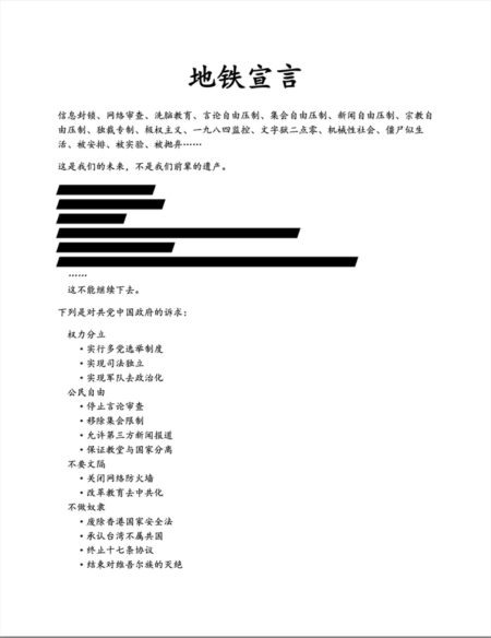 2022年的“白纸革命”给陈邦超带来启发,他认为运动缺乏明确方向:“我感觉那张白纸应该是填写什么上去比较好一点,那我开始就在疫情刚开放的时候, 2022年12月左右,开始制作地铁宣言。”这份宣言由他一人创作,涵盖教育改革、拆除防火墙、司法独立、新疆人权等诉求。