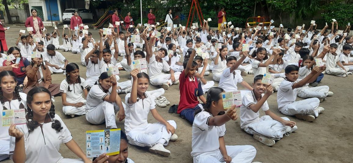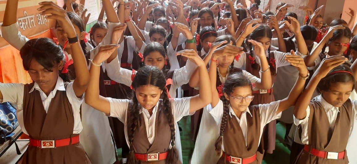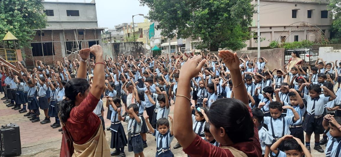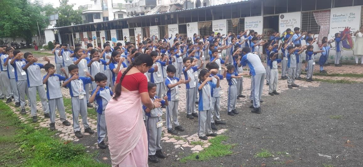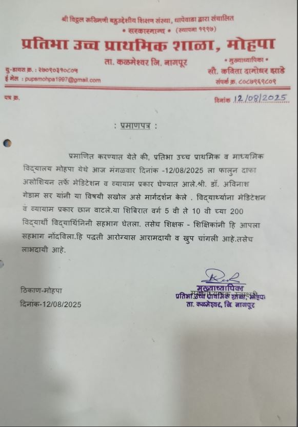 “兹证明,2025年8月12日,星期二,阿维纳什·格达姆博士(Dr. Avinash Gedam)和法轮大法学员在莫赫帕的普拉蒂巴高级小学与中学教法轮大法功法。