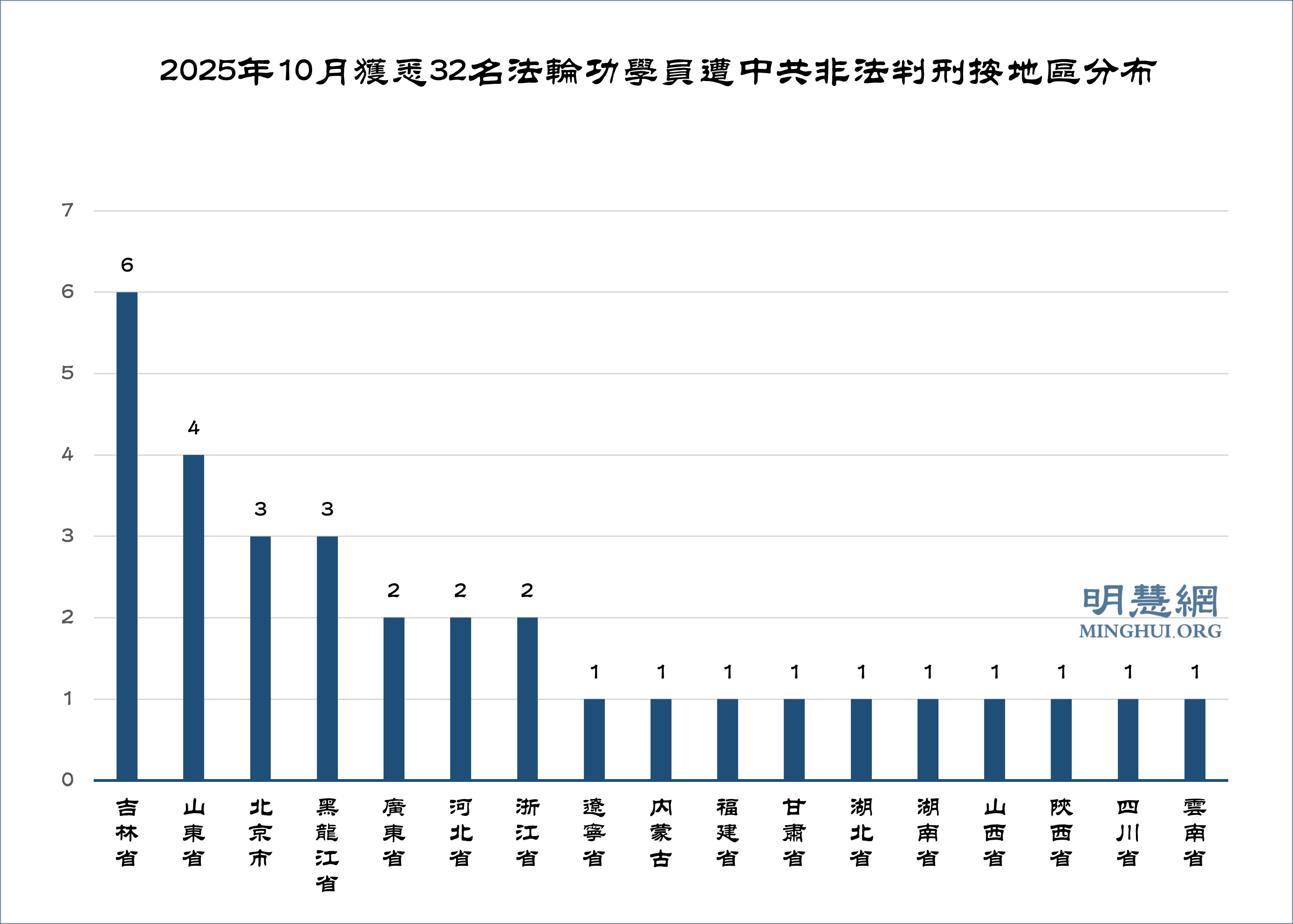 这些法轮功学员来自17个省、自治区、直辖市。迫害最严重的地区依次为:吉林省6人、山东省4人,北京市、黑龙江省各3人,广东省、河北省、浙江省各2人。