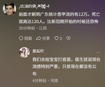 “这次甲流非常厉害,打了流感疫苗有的可以,有的没用。”“前面才刷到广东统计患甲流的有12万。死亡就高达120人。比新冠刚开始的时候还恐怖。”“我们(吉林)这边最近一大波人中招,孩子学校每个班都请假过半。我家娃前几天中招了。”“邻居家三岁的娃甲流三天去世了,今年太狠了,姐妹们一定要给孩子增强免疫力啊。”