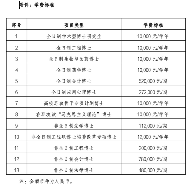 学费方面,全日制理工科博士每年1万元(人民币,下同);非全日制会计博士整个学习期(4至6年)学费达78万元,全日制会计博士52万元,全日制心理学博士27万元。