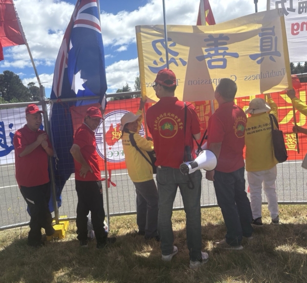 澳洲法轮大法佛学会发言人戴乐表示,这些人乘坐巴士前来,许多人隶属于受中共统战部控制的民间组织,如同乡会。 他们多次强行用旗帜遮挡法轮功学员的横幅,推搡包括老年妇女在内的和平请愿者。