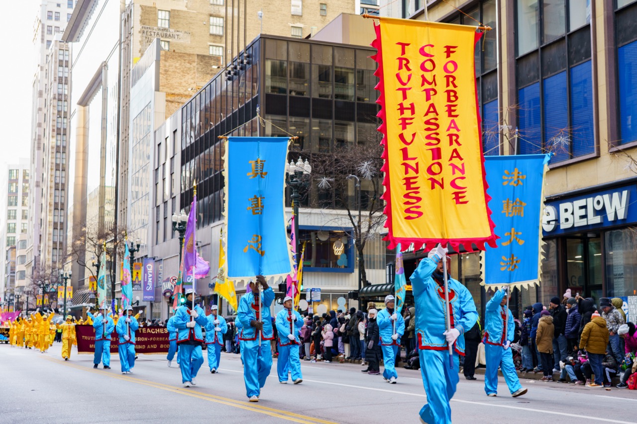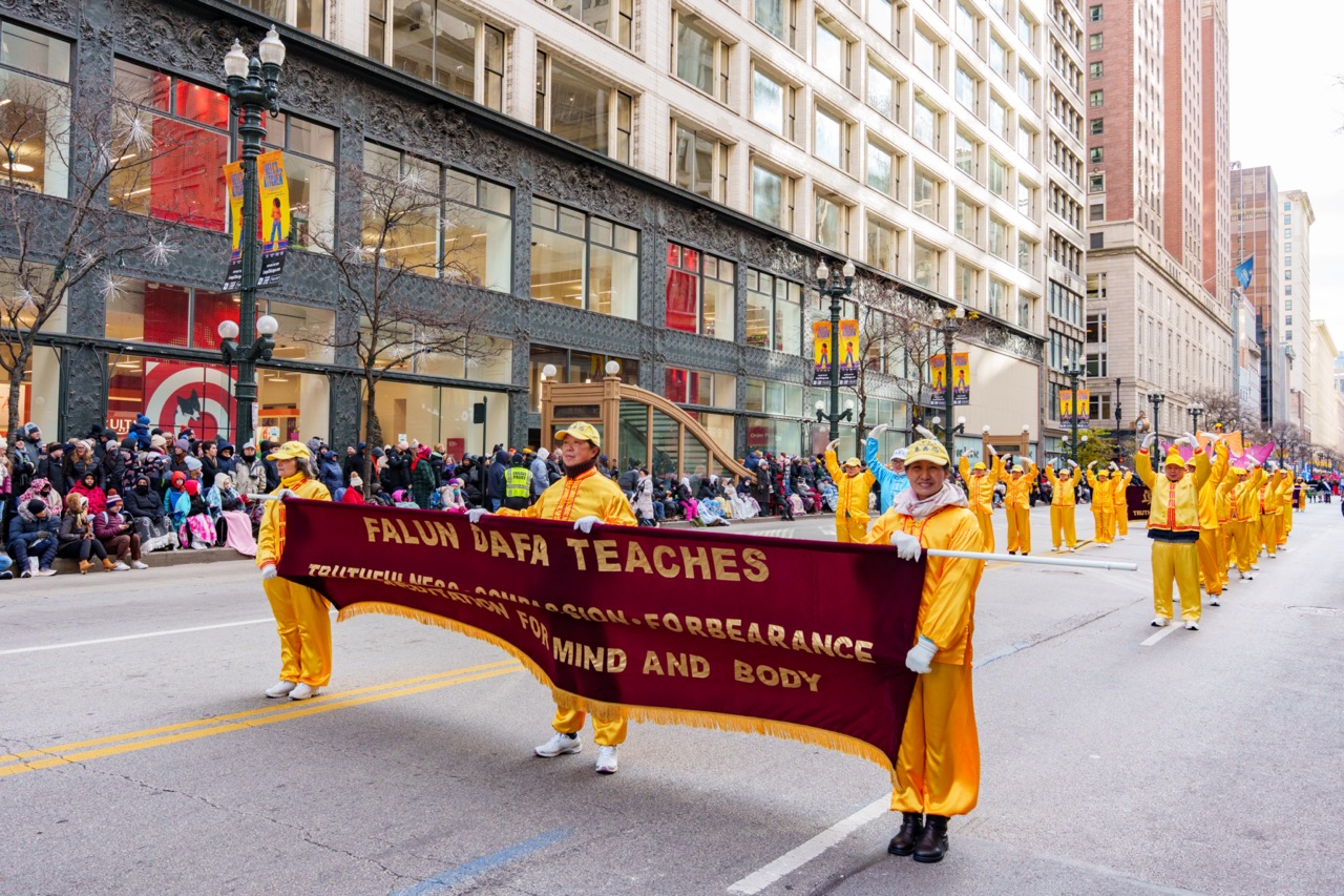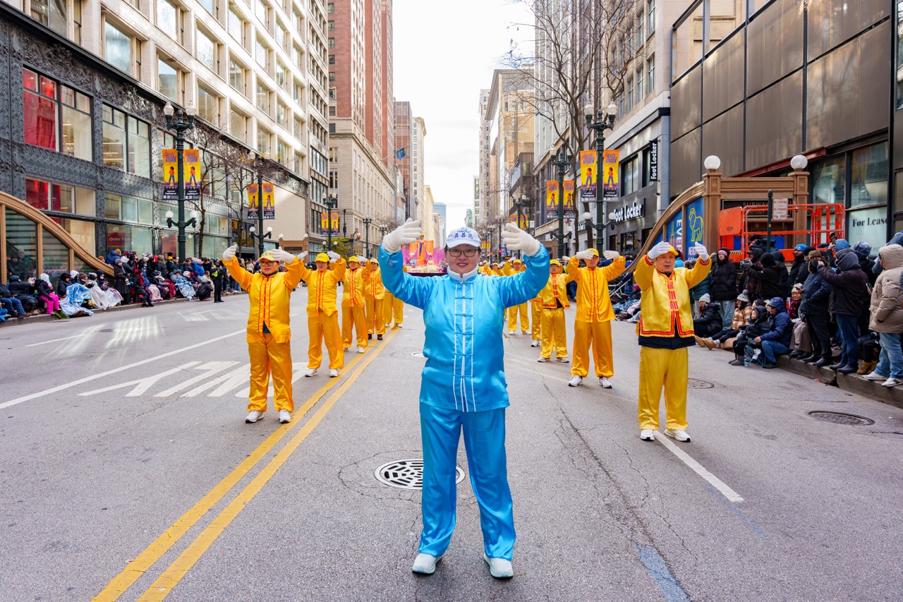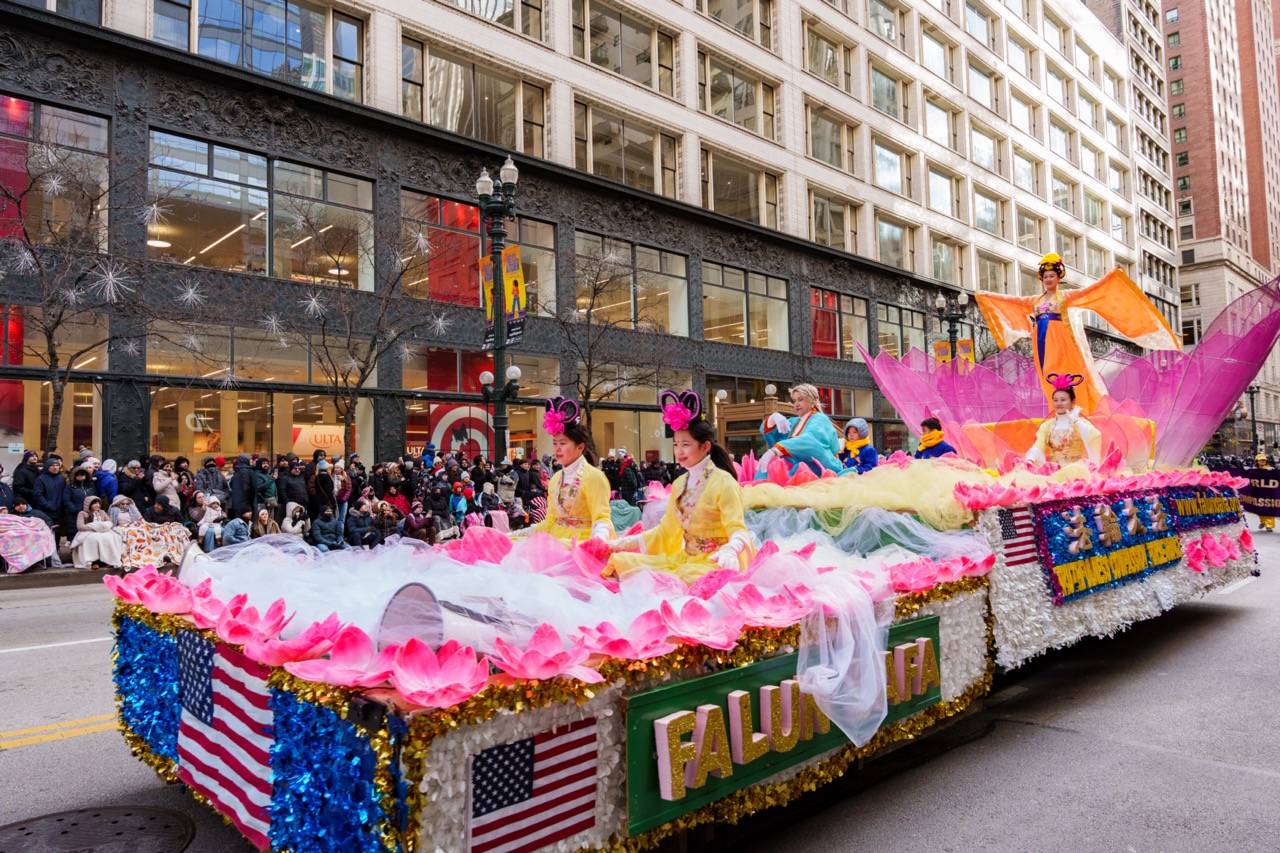 大芝加哥地区的法轮功学员今年连续第22年参加游行,学员们以庄重的旗阵、祥和的炼功方阵和壮观的大莲花花车吸引了现场观众,许多观众模仿学炼功法动作,沿途观众掌声、喝采声不断。