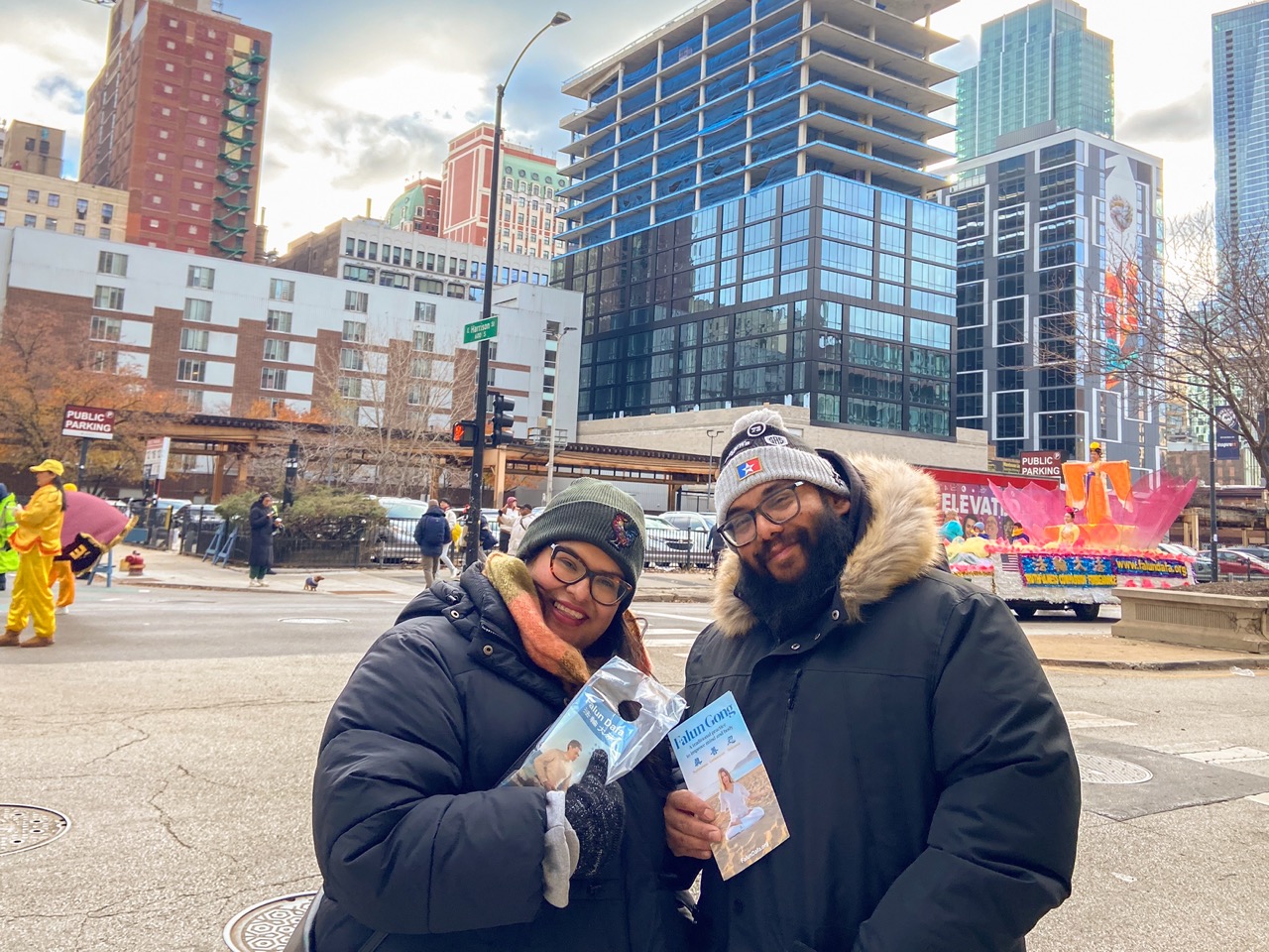 芝加哥居民戈麦斯(Gomez)和太太盖比(Gaby)表示他们很高兴在这次游行中了解到法轮大法。虽然这是他们第一次得到法轮大法的信息,盖比说:“我很想更多了解这个功法。”看到法轮功的花车时,盖比也非常兴奋,她对法轮功学员说:“花车太棒了!很高兴在这里看到你们。”