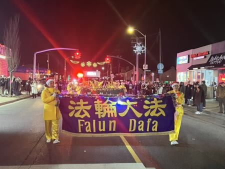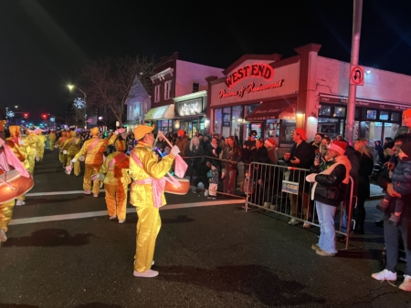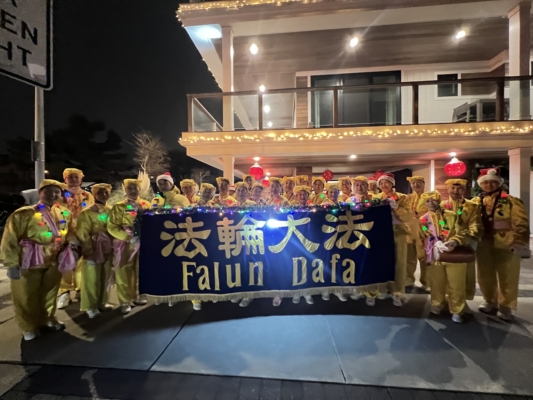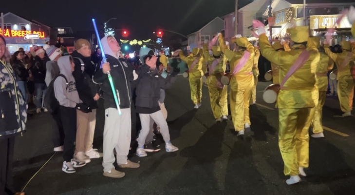 2025年12月15日,12月13日晚,纽约长岛长滩(Long Beach)举行一年一度的圣诞点灯游行,民众密密麻麻挤满街头观看。法轮大法腰鼓队再度参加,向居民祝贺圣诞,送去欢乐和“法轮大法”的祝福,观众喝采声、欢呼声不绝于耳,掀起一个又一个高潮。