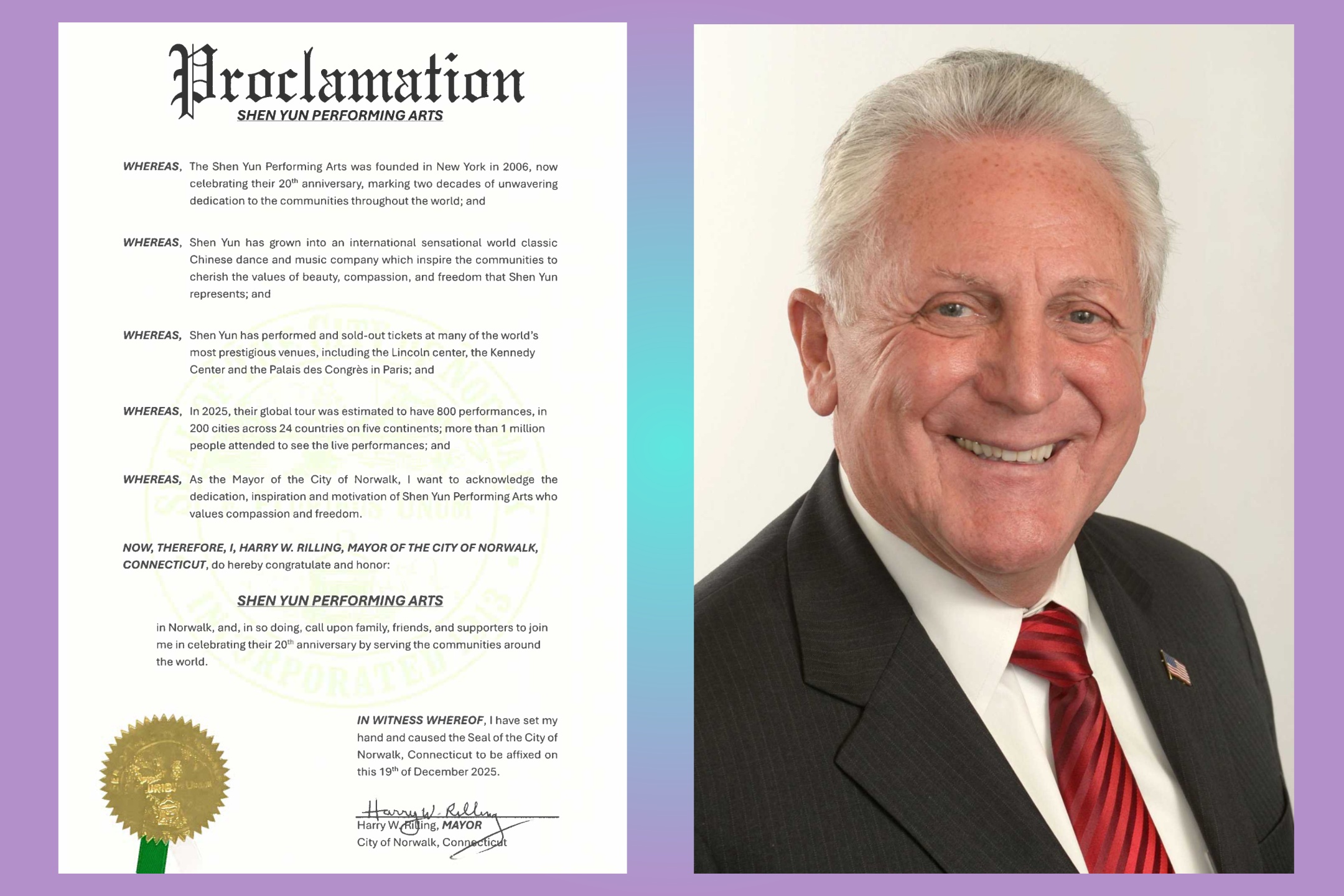 “鉴于此,本人——康涅狄格州诺沃克市市长Harry W Rilling,在此向神韵艺术团致以祝贺与敬意,同时,呼吁(他们的)家人、朋友和支持者与我一同庆祝神韵服务全球社区20周年。