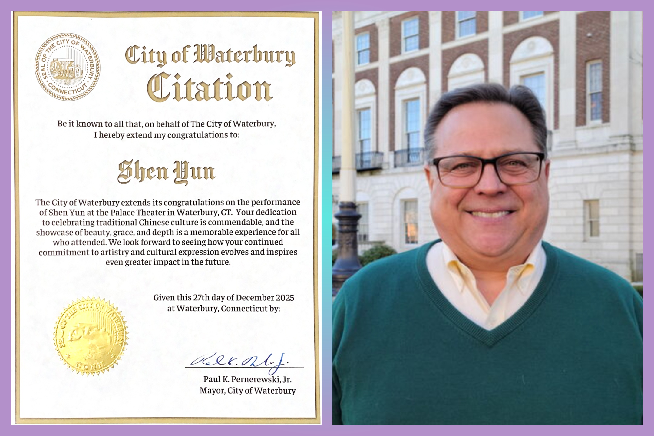 “沃特伯里市对神韵在康涅狄格州沃市派雷斯剧院的演出表示祝贺。”在沃市的嘉奖令中,市长Paul K. Pernerewski, Jr.称赞神韵艺术家: