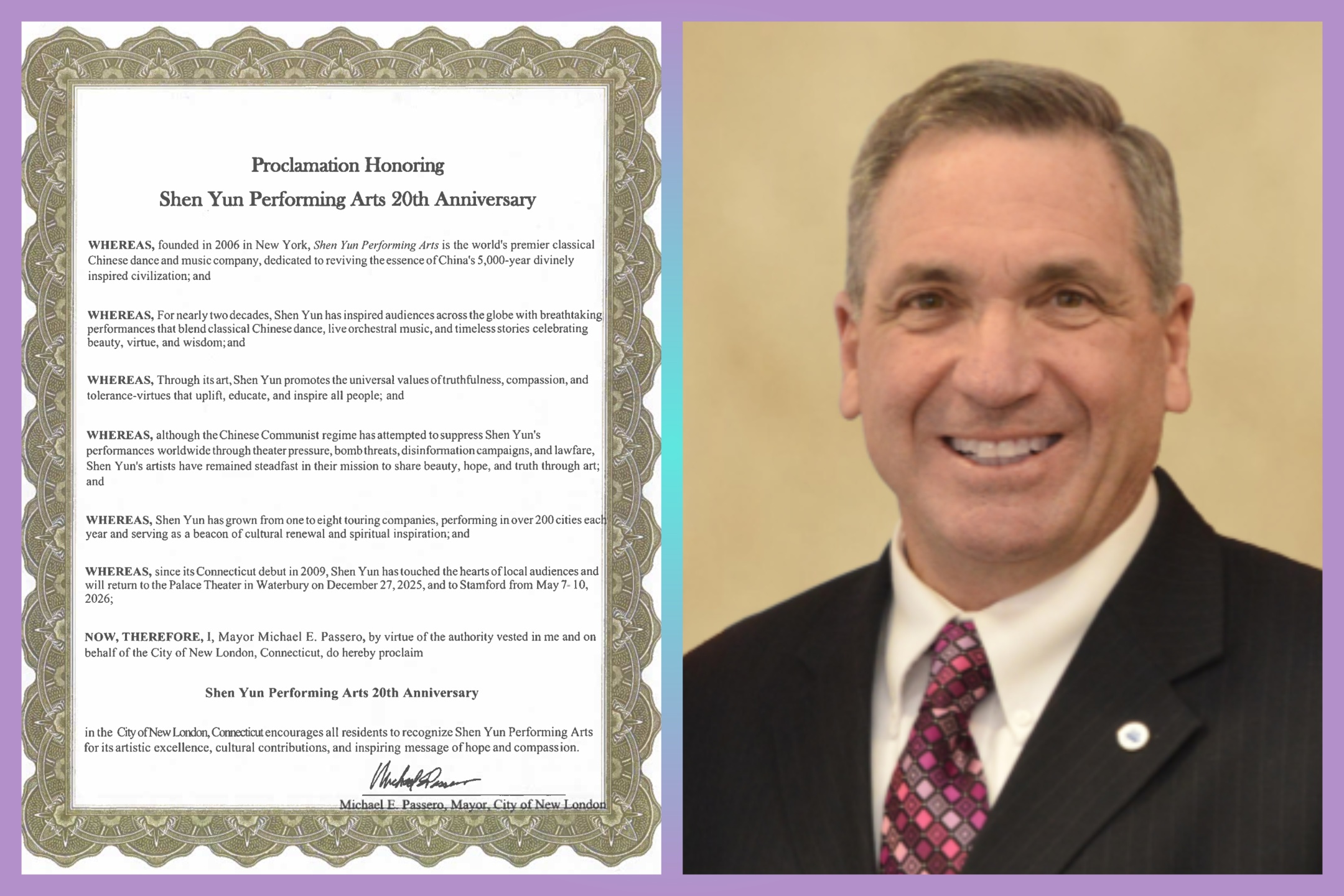 此外,纽伦敦市(New London)市长Michael E. Passero也在褒奖令中“敬贺神韵艺术团创立20周年”。Passero说: