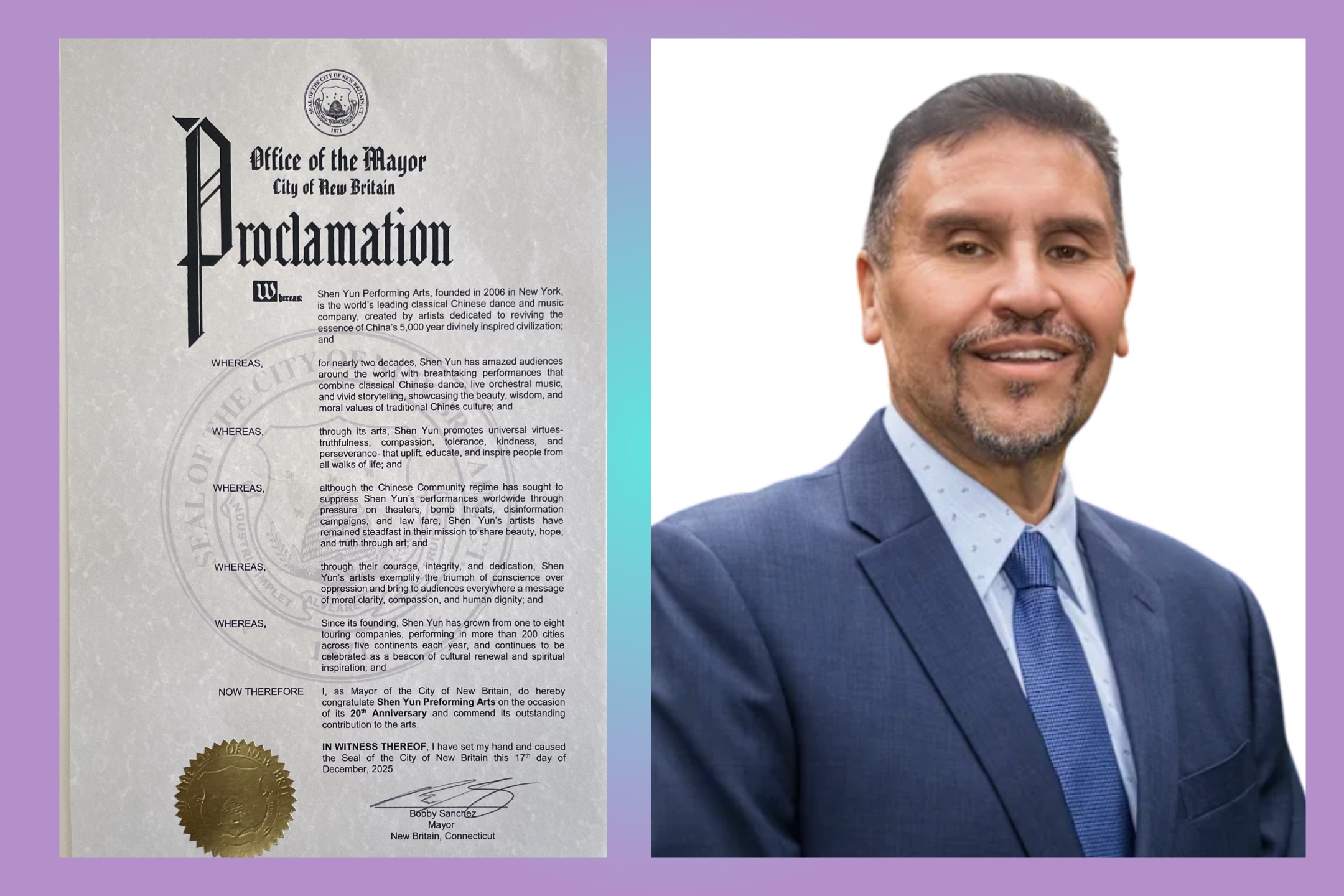 适逢神韵艺术团创办20周年并开启2026全球巡回演出,康州六个城市市长分别颁赠褒奖证书,迎接这台顶级演出回归康州。市长们盛赞神韵是文化重生、精神启发的灯塔,所传达的“希望与慈悲”的主题讯息鼓舞人心。