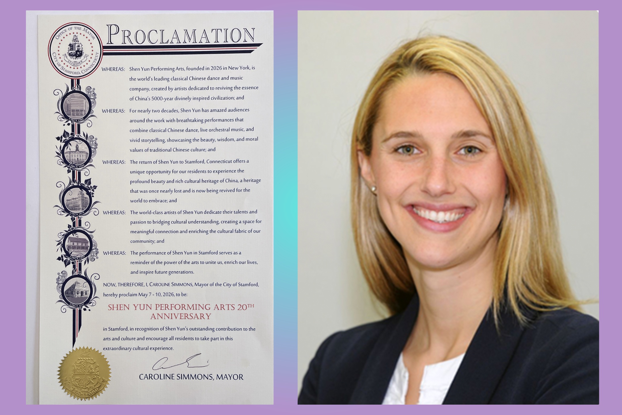 “因此,如今,我,斯坦福德市市长卡罗琳‧西蒙斯(Caroline Simmons),特此宣布2026年5月7日至10日为:神韵艺术团创立20周年纪念日,以表彰神韵对艺术与文化的杰出贡献,并鼓励所有居民参与这一非凡的文化体验。”