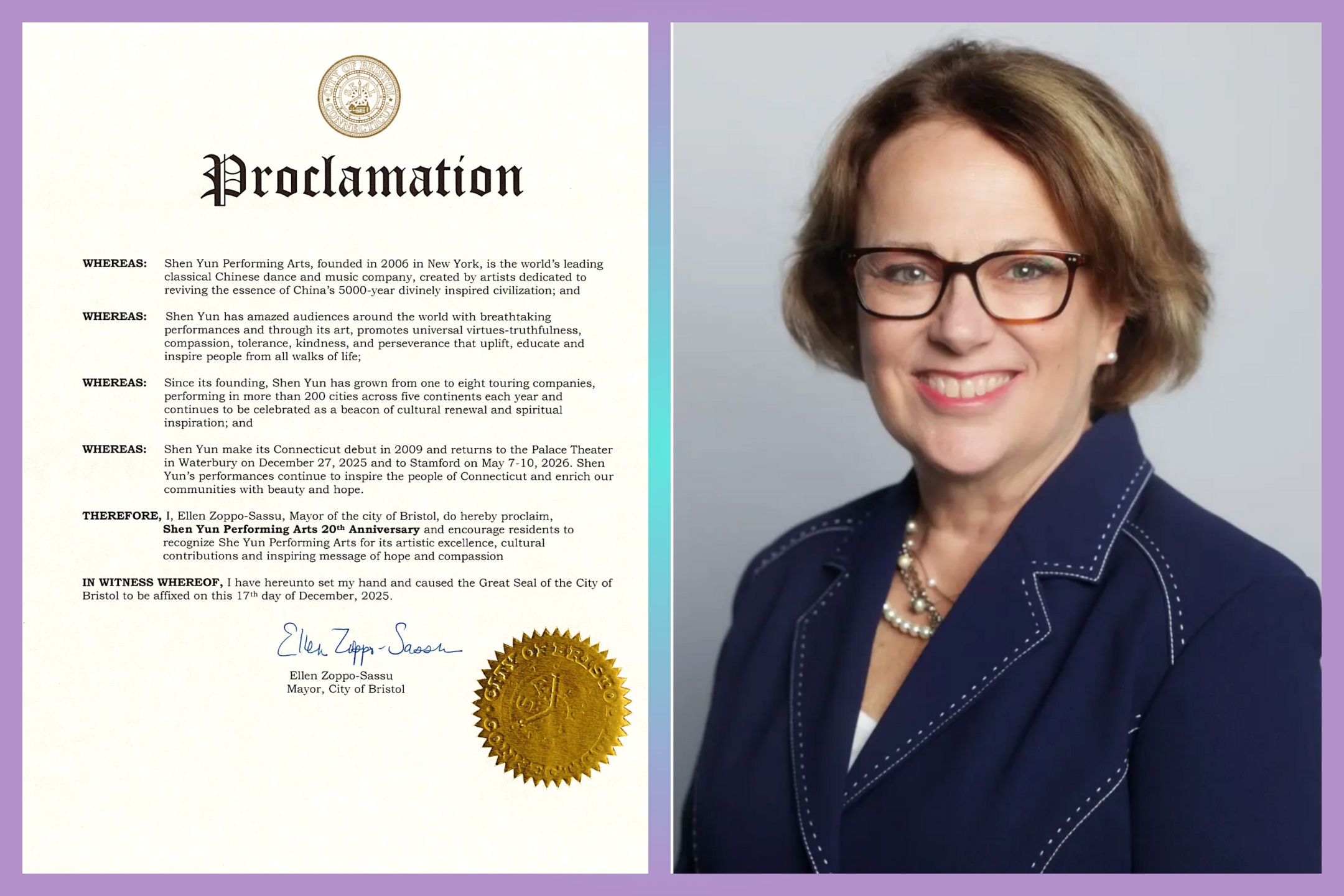 “因此,我,布里斯托尔市市长Ellen Zoppo-Sassu,特此宣布:神韵艺术团创立20周年。