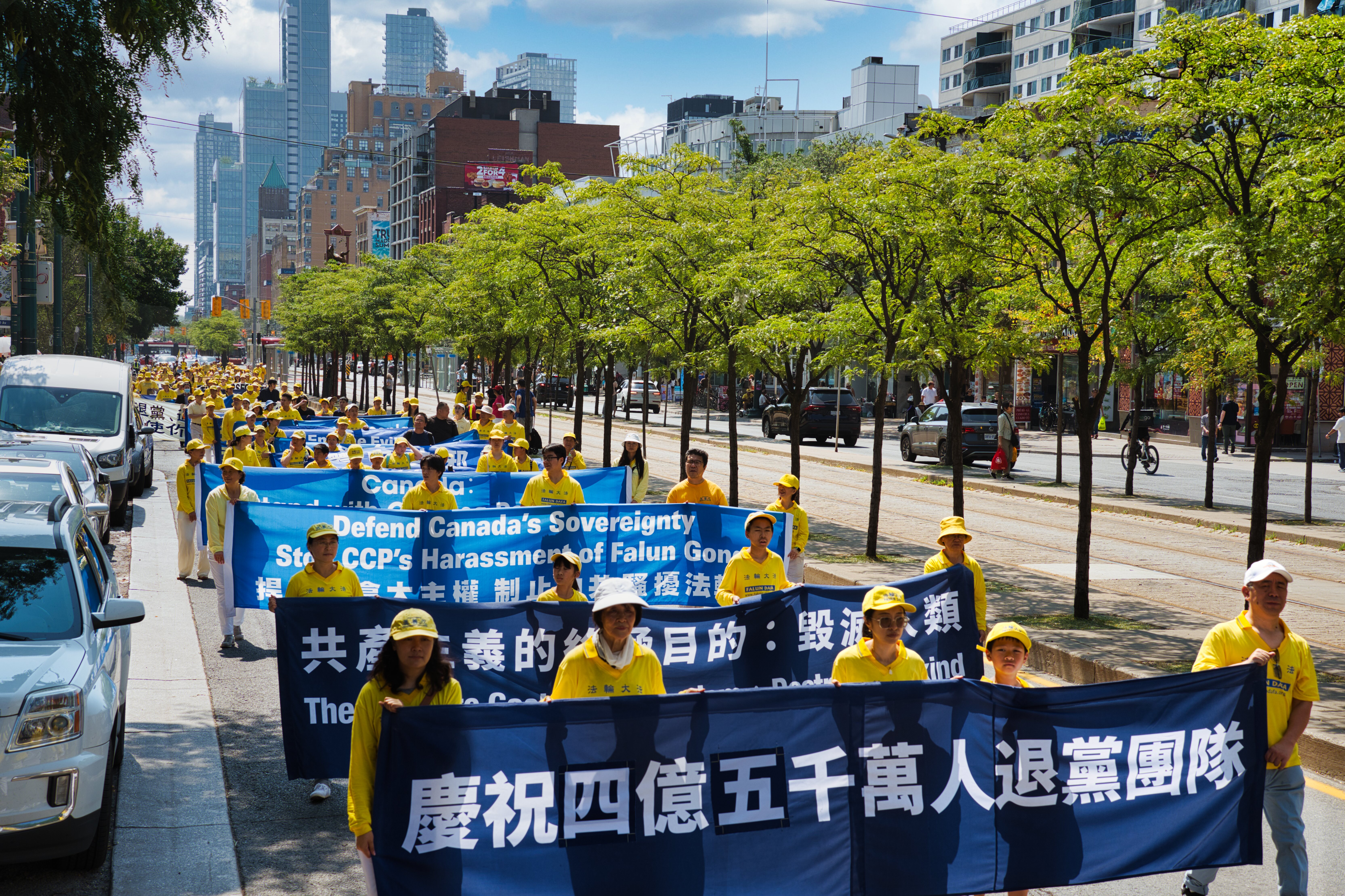8月16日,加拿大多伦多法轮功学员在市中心举行集会和游行,声援4.5亿中国人退出中共党、团、队组织,呼吁民众觉醒,解体中共,停止迫害。