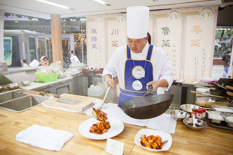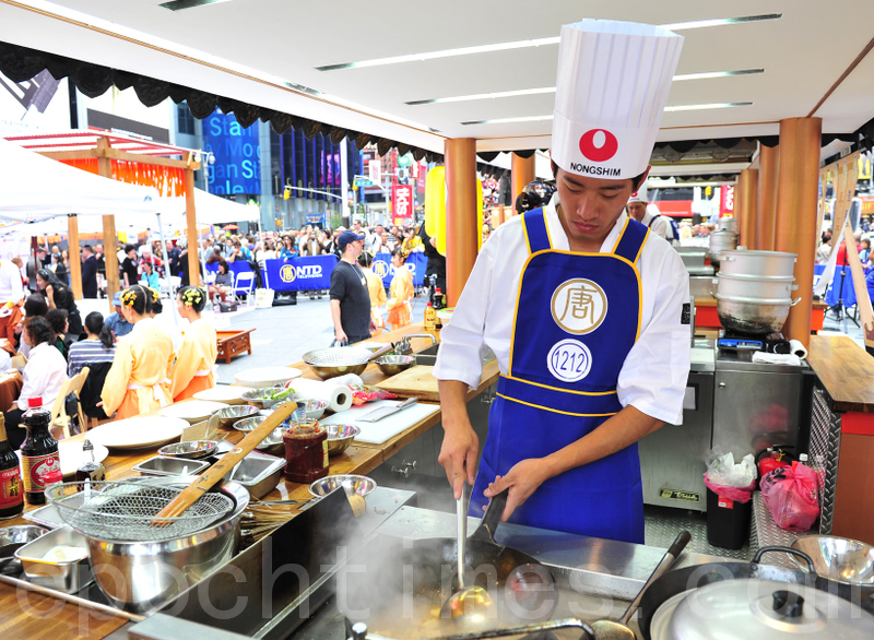 2011年、2016年,新唐人厨技大赛来到了纽约时代广场。一面大锣响敲,启动了大赛。悠扬的古典乐声中,身穿深青围裙的参赛厨师走向仿唐风,青瓦为顶的厨房;身穿橘色古装的侍女站立在两旁。路中间是几座画着敦煌图案的大圆伞,伞下是供人坐下,品尝美食的桌椅。古长安与中华传统文化再现纽约,令来自四方的游客惊艳。