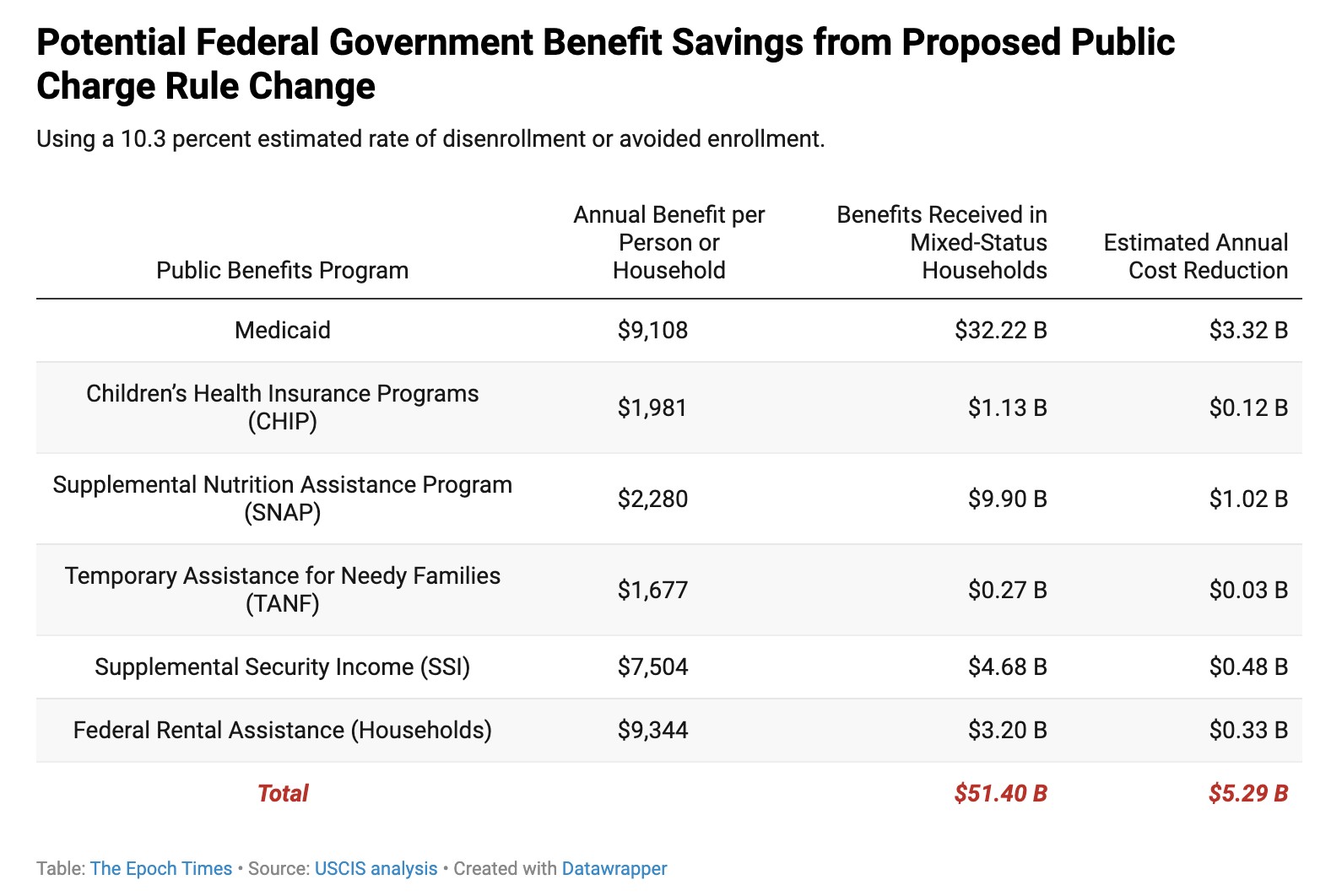国土安全部在其提案中指出,由于部分人群将停止或避免申请公共福利,新政策每年可削减约89.7亿美元的政府支出。其中联邦政府支出将减少52.9亿美元,各州支出将减少36.8亿美元。