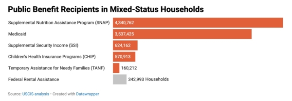根据国土安全部发布的数据,混合身份家庭中约有920万人领取了食品券、联邦医疗补助、儿童健康保险计划、贫困家庭临时援助和补充保障收入等福利。此外,约有34.3万户家庭领取联邦租房援助。