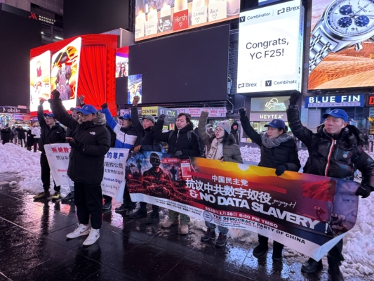 中国民主党成员1月28日在纽约时代广场,抗议中共数字监控和网络防火墙。(林丹/大纪元)