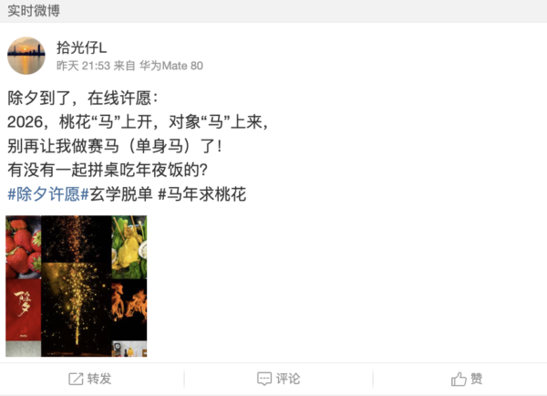 新浪财经2月17日报导广州除夕夜,来自山西的小张参与了拼桌吃年夜饭:“以前一个人过年,对着电视吃外卖,冷冷清清的。今年在群里看到招募,立刻就报名了。在这里,没人问你工资多少、对像找了没,大家只分享美食和心情。”