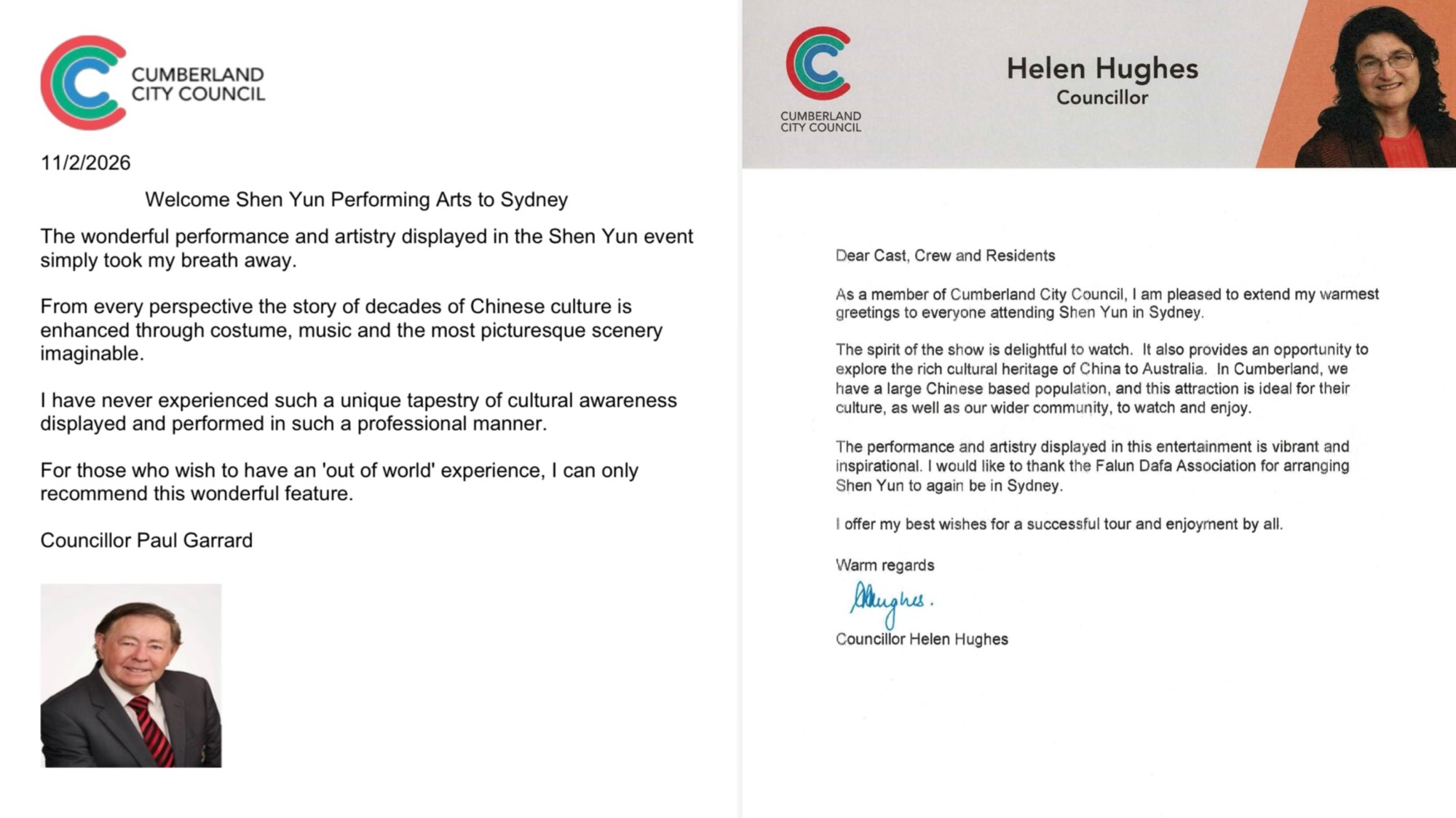 Cumberland市另一位市议员海伦‧休斯(Helen Hughes)在贺信中表示,“神韵演出也为澳洲提供了一个了解中国丰富文化遗产的绝佳机会。Cumberland为拥有庞大华人的社区,神韵演出不仅对他们的文化意义非凡,也为我们整个社区带来了欢乐。