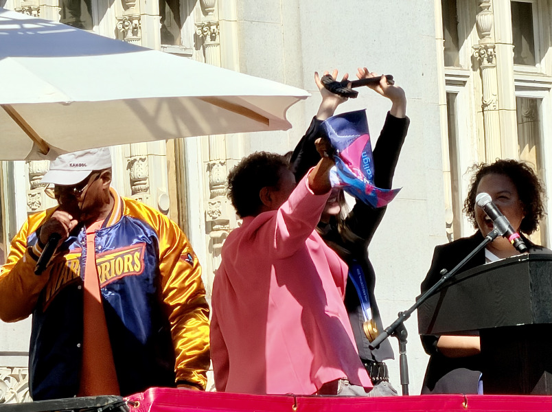 活动由Visit Oakland、奥克兰市政府与市长芭芭拉‧李(Barbara Lee)办公室主办,并由Invisalign与PG&E协办。现场气氛热烈,民众挥舞彩巾、高声欢呼,庆祝刘美贤取得的卓越成就。台下的父亲刘俊(Arthur Liu)满脸笑容,举着手机记录这历史一刻。