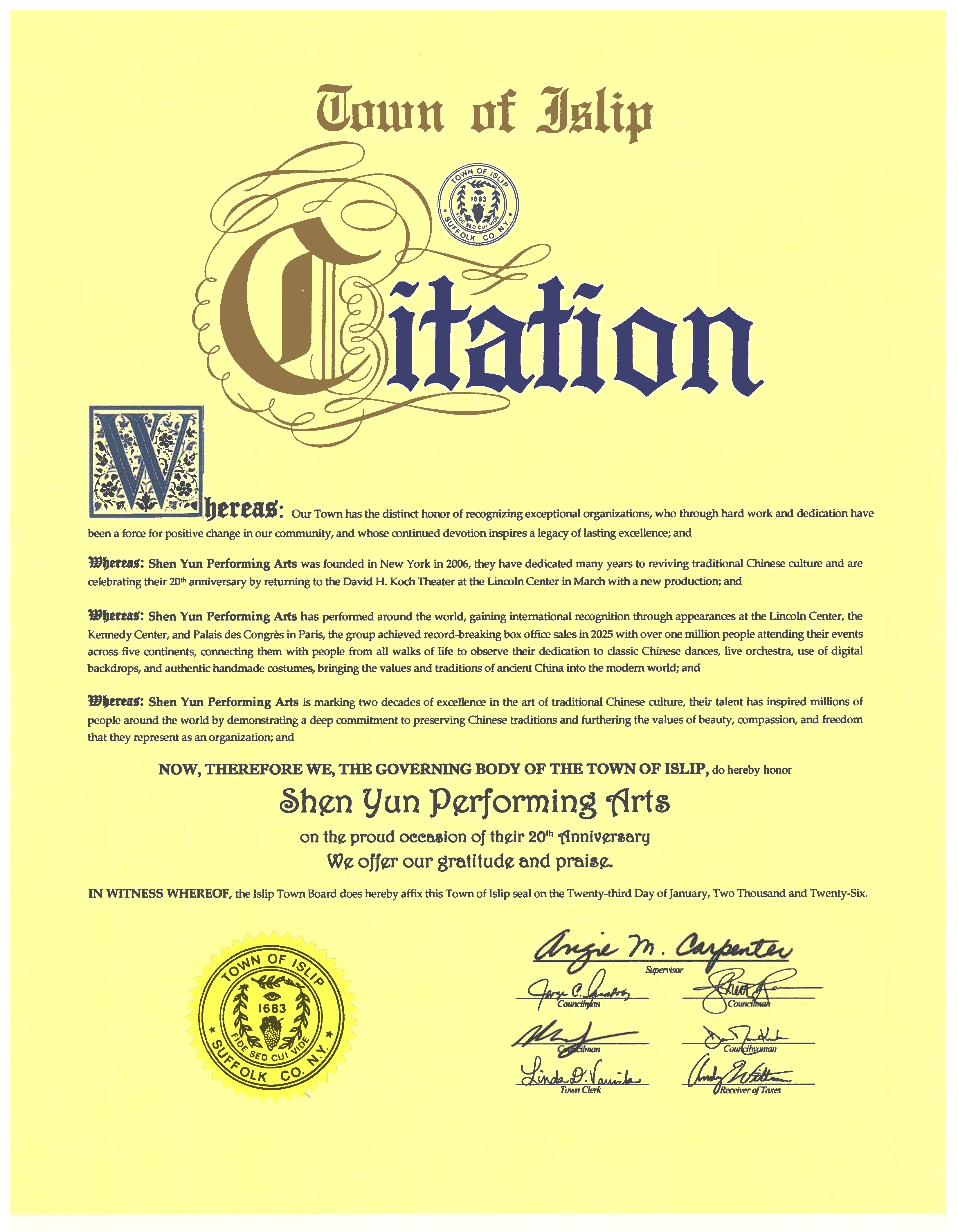 萨福克县艾斯利普镇(Islip)镇长Angie M. Carpenter与四位镇议员Jorge Guadrón、DawnMarie Kuhn、Michael J. McElwee和Jr.,John M. Lorenzo,以及镇书记和税务员等,联合签署褒奖状致敬神韵。官员们表示: