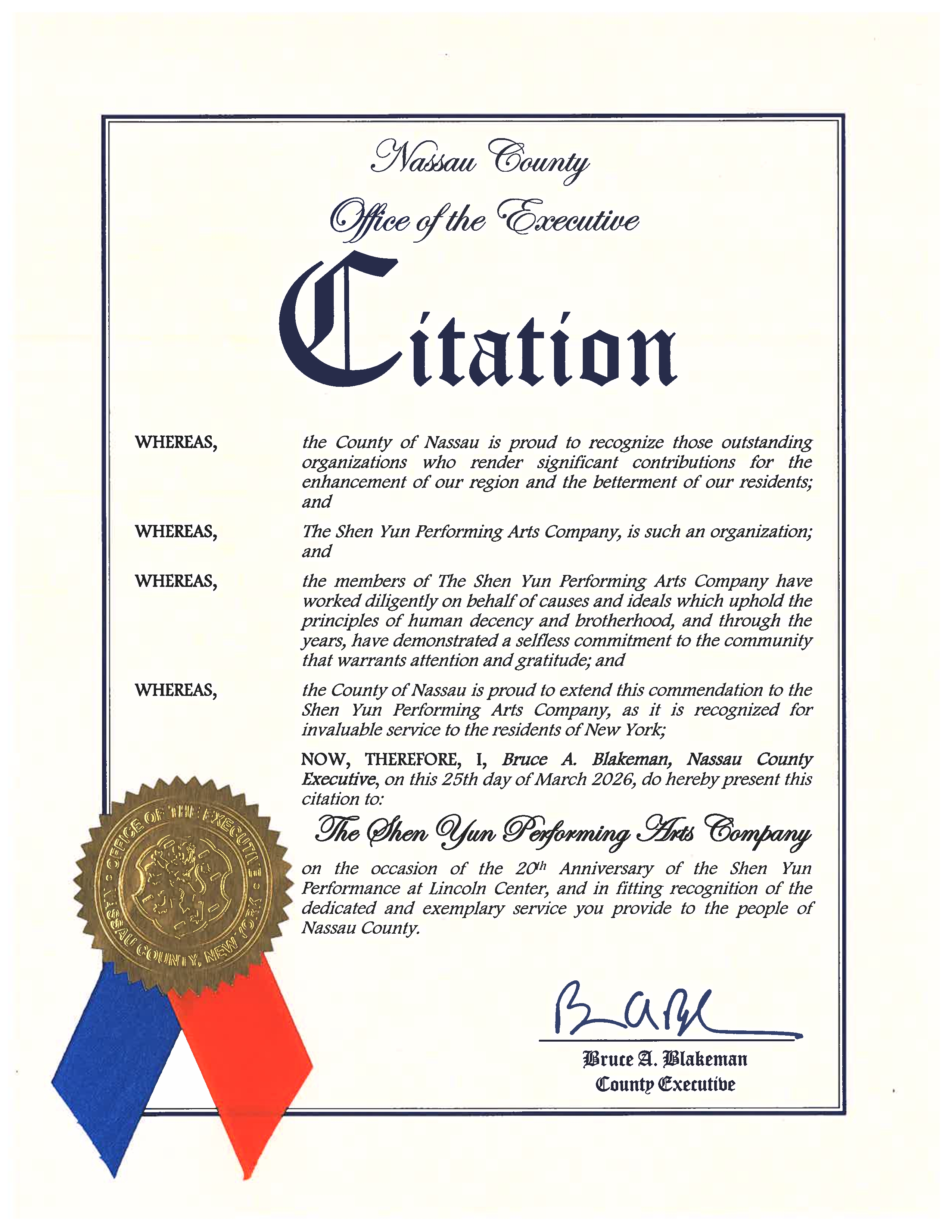 “鉴于此类活动极具价值,值得本议会予以正式表彰,特此宣告:拿骚县议会民主党团成员,谨祝贺神韵2026年3月25日带来全新演出,及二十年来作出丰富社区生活的贡献。”