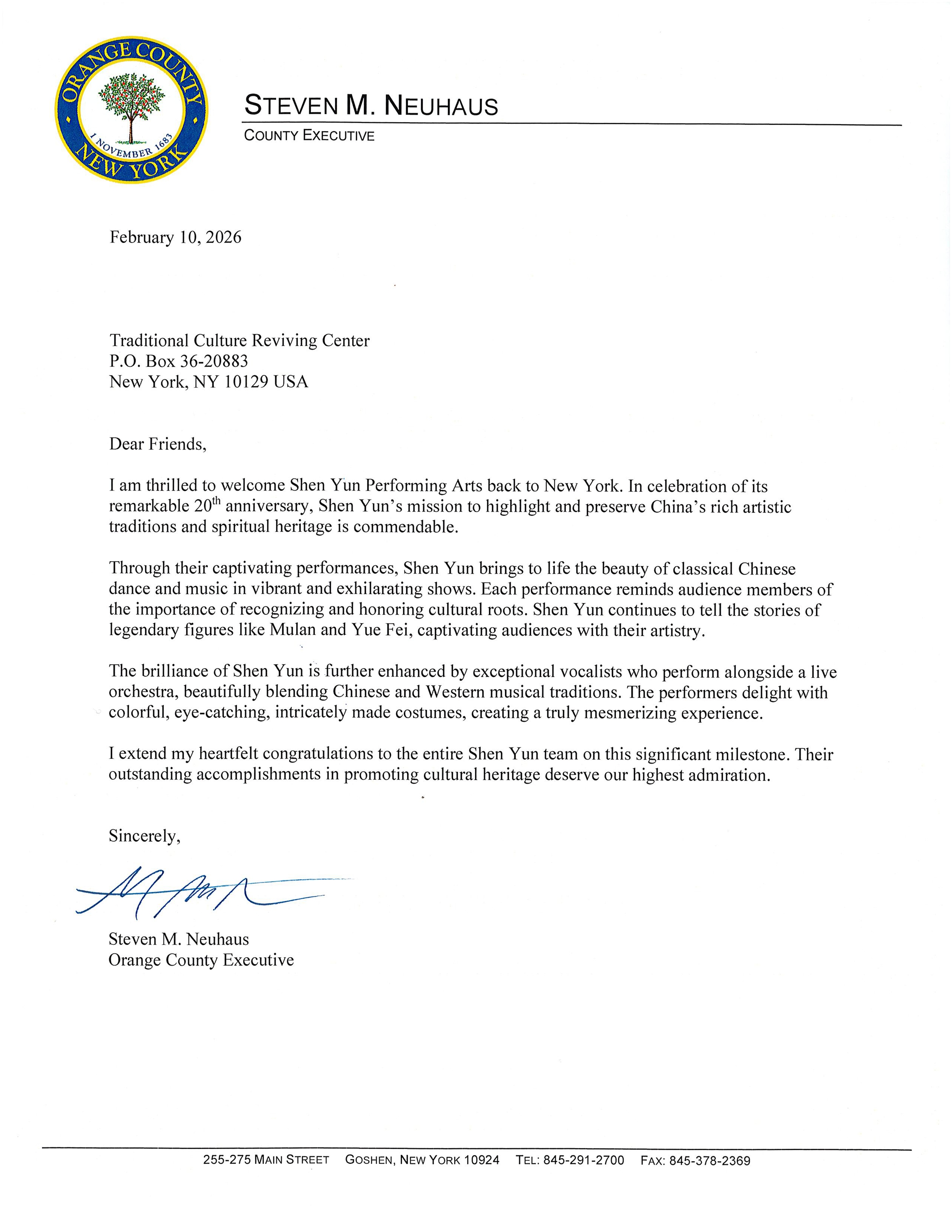 Neuhaus在“县长褒奖公告”中写道:“神韵艺术团二十年前创立,以复兴并传播五千年中华传统文化的美丽、智慧与道德价值为使命。”“自创立以来,神韵已发展成为享誉全球的古典中国舞与音乐团体,以卓越的艺术造诣、原创管弦乐作品及震撼人心的演出征服了各大洲的观众。”