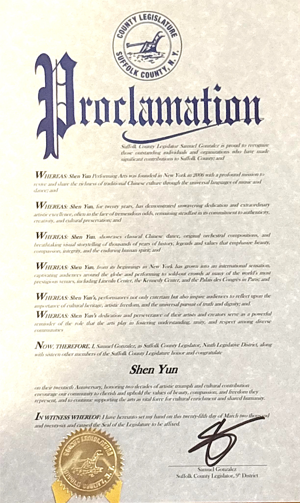 身为萨福克县第9选区议员,Gonzalez联同县议会其他十六位成员,向神韵致以崇高敬意与诚挚祝贺,“并鼓励本社区珍视并恪守神韵所代表的‘美、慈悲与自由’之价值,持续支持艺术成为丰富文化与凝聚人类共同情感的重要力量”。