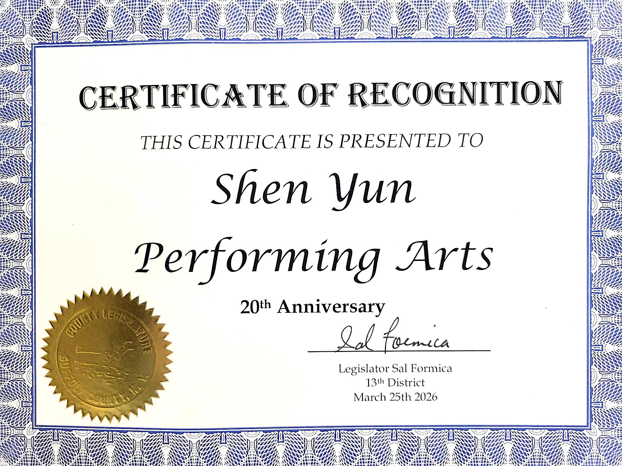 神韵创立20周年之际,萨福克县(Suffolk County)第9选区议员Samuel Gonzalez和第13选区议员Sal Formica也分别向艺术团颁赠了褒奖状。