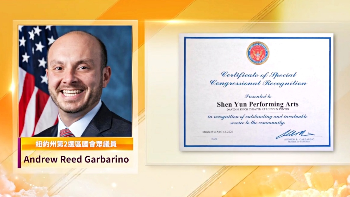 纽约州第2选区联邦众议员安德鲁‧里德‧加巴里诺(Andrew Reed Garbarino)向神韵颁发国会特别表彰证书,以表彰神韵艺术团对社区所作出的卓越且无可估量的贡献。