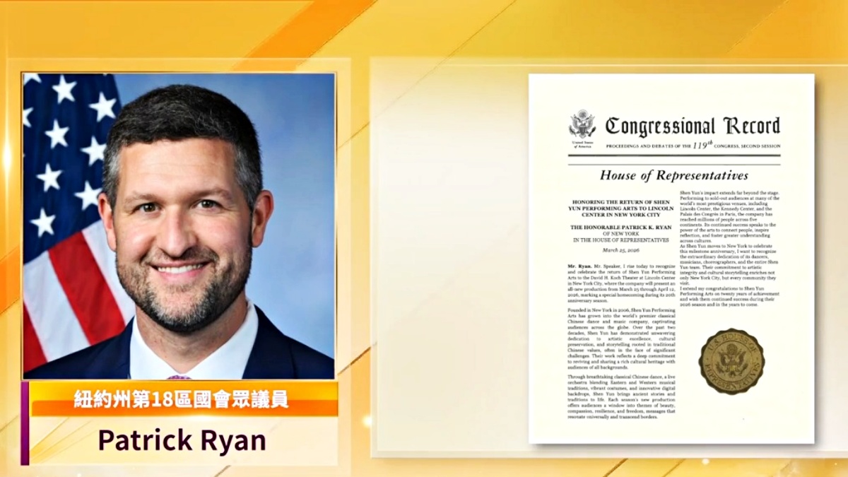 纽约州第18选区国会众议员帕特里克‧瑞安(Patrick Ryan)写道:“特此表彰神韵艺术团重返纽约市林肯中心大卫寇克剧院(David H. Koch Theater)演出。神韵艺术团将于2026年3月25日至4月12日呈现全新节目,正值神韵二十周年庆典之际,此次演出堪称一场特别的归乡之旅。”